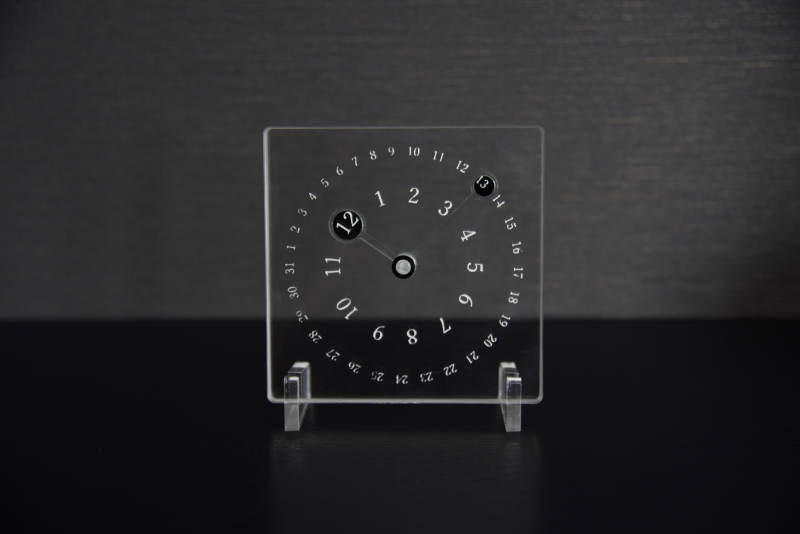 長針が日付、短針が月を示す、時計をモチーフとした万年カレンダーです。タイル状にプレス成型されたガラスの2面を研磨し、数字をレーザーで刻印しました。 透明な文字盤の裏側に、先端に黒い円盤のついた針がついており、針の位置を合わせると表に刻印された数字が目立って見える仕組みです。